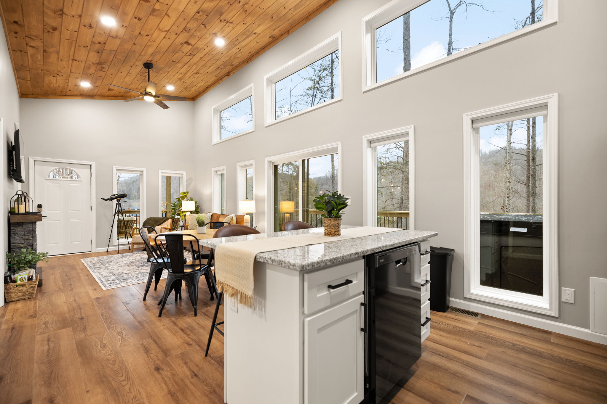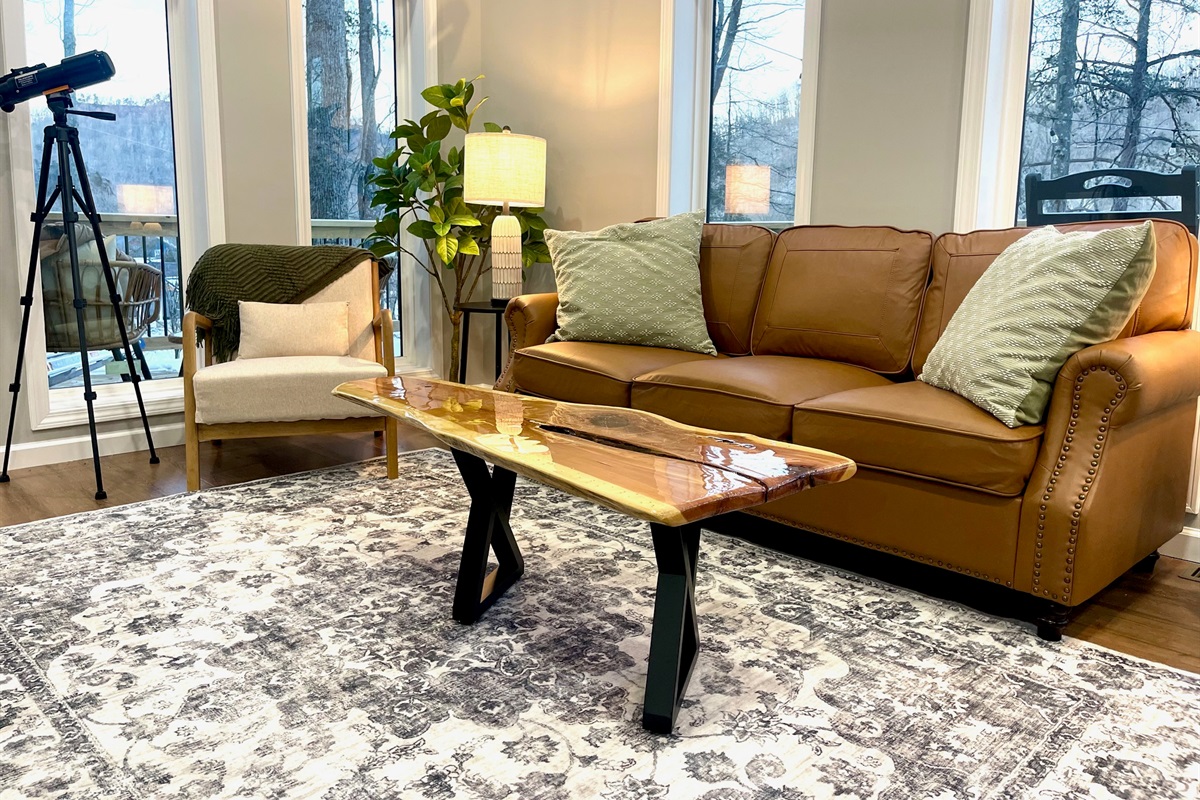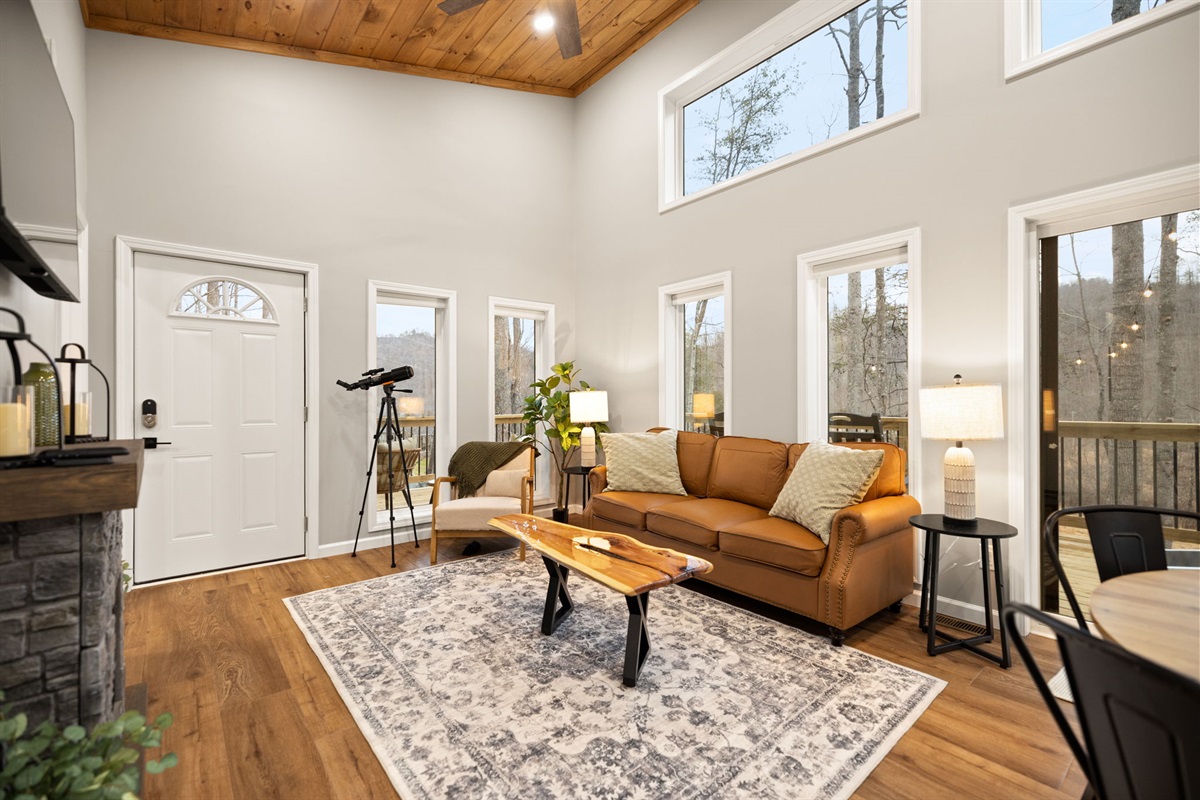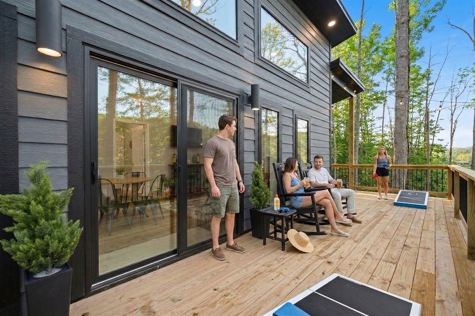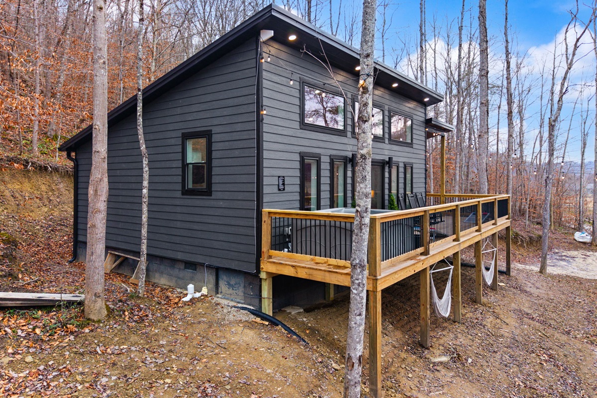 Outdoor time is a highlight here. Soak in the 5-person hot tub (open year-round!), grill dinner, play a game of cornhole, or sit back in a rocking chair and take in the fresh mountain air. With low light pollution, the night skies here are incredible — use the telescope for a beautiful night of stargazing out on the deck!