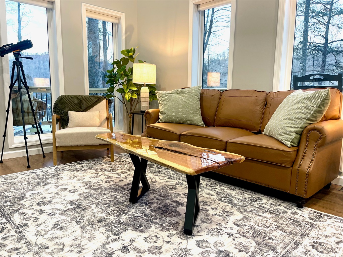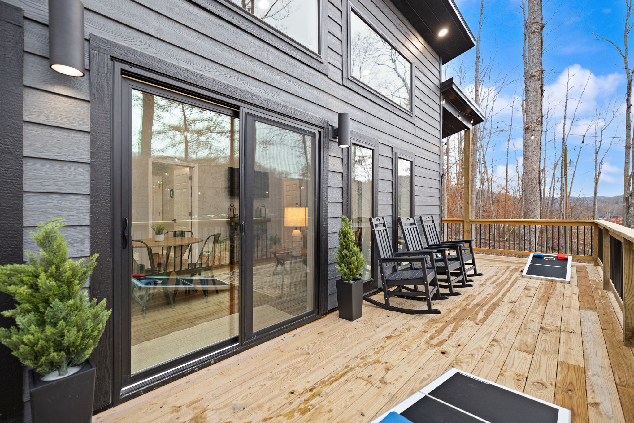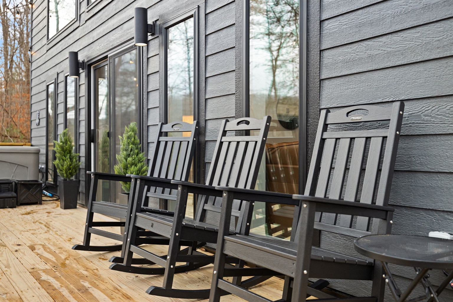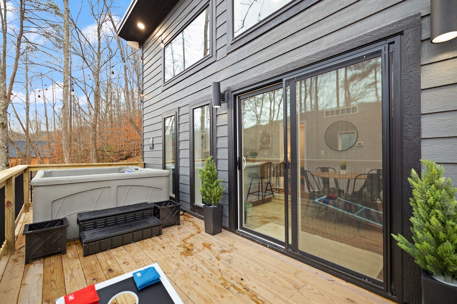 Outdoor time is a highlight here. Soak in the 5-person hot tub (open year-round!), grill dinner, play a game of cornhole, or sit back in a rocking chair and take in the fresh mountain air. With low light pollution, the night skies here are incredible — use the telescope for a beautiful night of stargazing out on the deck!