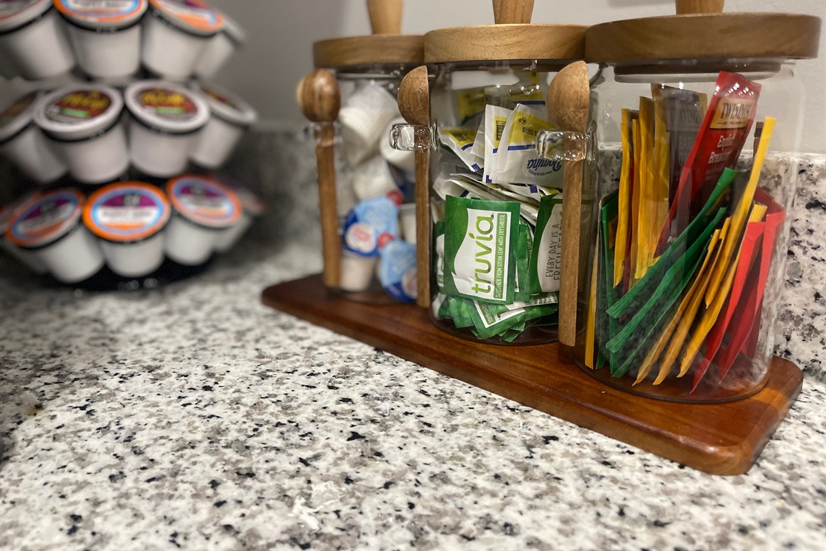 Mornings start off right with a complimentary coffee bar stocked with K-cups, teas, creamers, and sweeteners for our K-Duo Keurig. If coffee grounds are more your style, feel free to bring your favorite to enjoy during your stay!